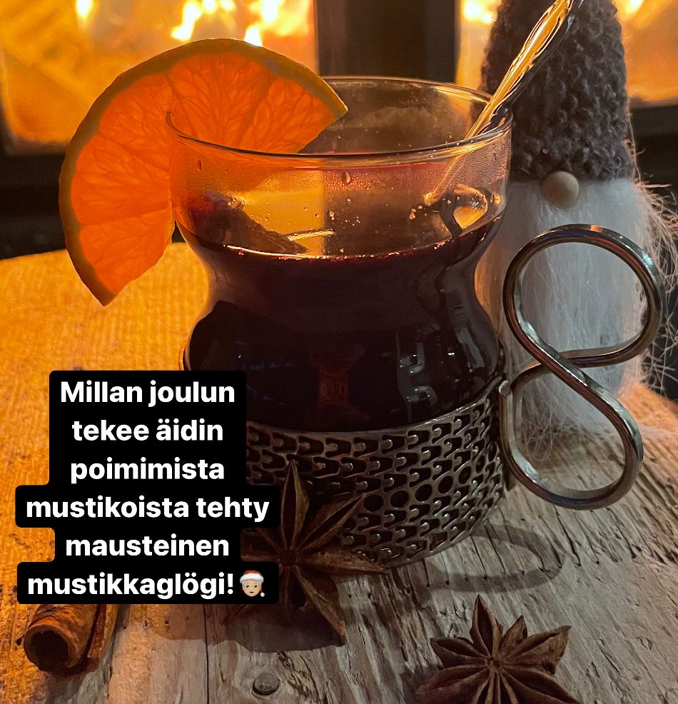 Tähän ihanaan glögiin voi käyttää niin kaupan mustikoita kuin itse (kröhöm, äidin) keräämiä metsämustikoita, joilla voi palailla loppukesän havumetsien tunnelmiin.