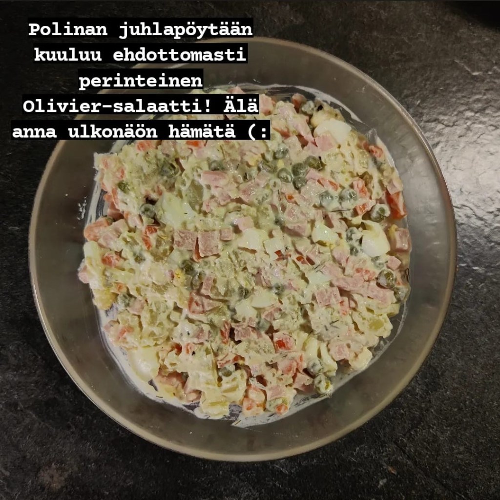 Venäjällä ja monissa muissa slaavilaisissa maissa uusivuosi vastaa suomalaista joulua ja on vuoden odotetuin juhla. Vegaanisen version saat jättämällä kananmunat pois ja korvaamalla majoneesin vegaanisella versiolla ja lauantaimakkaran vaikka safutofulla.