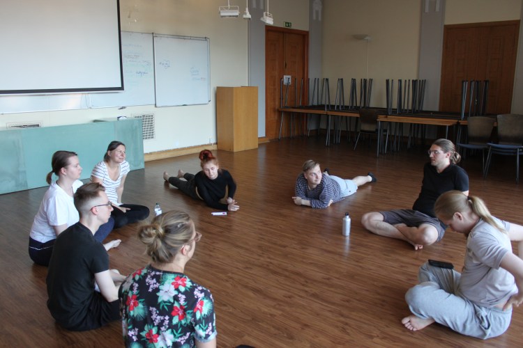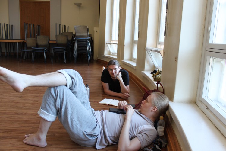 Porukka koottiin pääsykokeilla huhtikuun lopussa ja ekat tapaamiset pidettiin toukokuussa. Treenikausi on lähtenyt käyntiin eräänlaisella orientaatiolla ja harjoitukset koostuvat yleensä lämppien ja fiilisrinkien lisäksi valmistelevista impro-, liike- ja ryhmäharjoitteista. Treenien lopussa tehdään niiden pohjalta pidempi harjoite tai demo, eli lyhyt ryhmän toteuttama esitys. Koska olen ohjaajana ensi kertaa, en tiennyt yhtään mitä odottaa, mutta näyttelijöiden jengi on lyönyt ällikällä. Erityisesti harjoitteet, joissa näyttelijät pääsevät itse tuottamaan materiaalia, kuten esimerkiksi koreografioita omista arkirutiineistaan, sähköistävät ryhmän silminnähden. Vain harjoituksen vuoksi tuotetussa materiaalissa on jo nähtävissä analyysin ja kehittelyn potentiaali. En siis epäile hetkeäkään, etteikö tämä ryhmä tuottaisi syksyn katsojille jotain erityistä ja hämmentävääkin. Ohjaajana haasteenani ovat tulevat dramaturgiset valinnat, mitä sisällyttää esitykseen ja miten sitoa kaikki yhteen.
